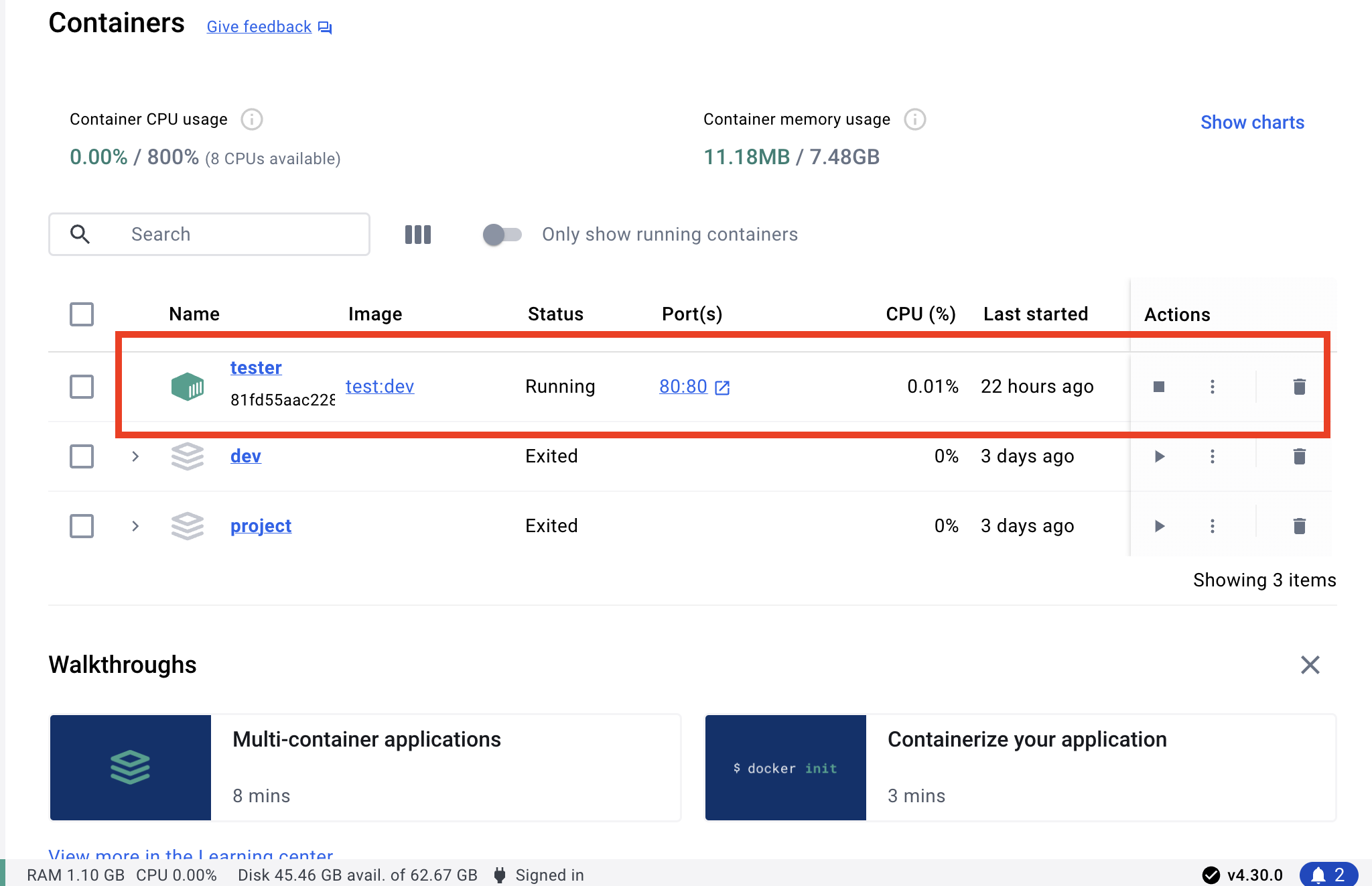 2. docker run -it --rm --name tester -p 80:80 test:dev : 방금 빌드한 'test:dev' 이미지를 사용하여 'tester'라는 이름의 컨테이너를 실행한다.